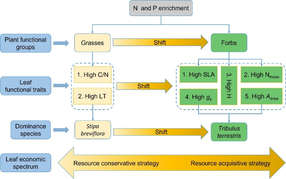 鄂尔多斯国家生态站站长黄振英研究团队,以内蒙古退化短花针茅(Stipa breviflora)草原为研究对象,采用随机区组裂区实验设计,基于连续两年5个氮水平和2个磷水平的养分添加野外原位控制实验,系统开展了氮磷养分添加对荒漠草原植物叶片与群落功能性状影响研究。结果表明,氮添加显著影响了除叶厚度之外其它绝大多数叶片形态与营养性状;无论磷添加与否,氮添加均显著提高了叶片氮含量,降低了碳氮比;氮添加显著提高了气孔导度,但除了蒺藜(Tribulus terrestris)以外,对光合速率并没有显著影响。与禾本科植物相比,一年生草本植物蒺藜在氮添加水平增加时表现出更强的竞争力(叶片氮含量、光合速率)。氮添加显著提高了群落功能性状,叶片氮含量、比叶面积、植株高度、气孔导度和光合速率,进而提高了群落地上生物量;磷添加显著提高了群落水平比叶面积,但降低了蒸腾速率和叶厚度。随着氮添加水平的增加,在低营养环境中占主导地位的资源保守型物种在高营养环境中逐渐被资源获取型物种所取代。本研究强调,在评估全球环境变化对草原群落组成与功能影响时,应充分考虑植物功能性状对养分添加的差异性响应以及物种之间不同的适应策略。